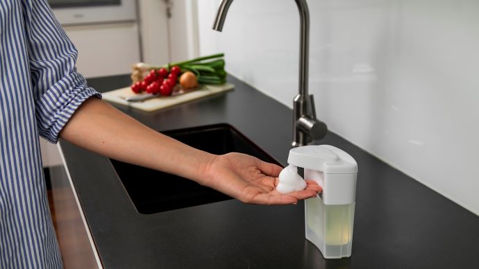 Das Desinfizieren viel beanspruchter Oberflächen wie zum Beispiel Türgriffe, Lichtschalter oder der WC-Spülung gehört ebenso dazu. Der hagi OBERFLÄCHEN DESINFEKT SCHAUM eignet sich hier hervorragend, da er besonders materialschonend ist. Er entfernt zuverlässig 99,99 % aller Bakterien und kann ohne Handschuhe verwendet werden, da er dermatologisch geprüft ist.
